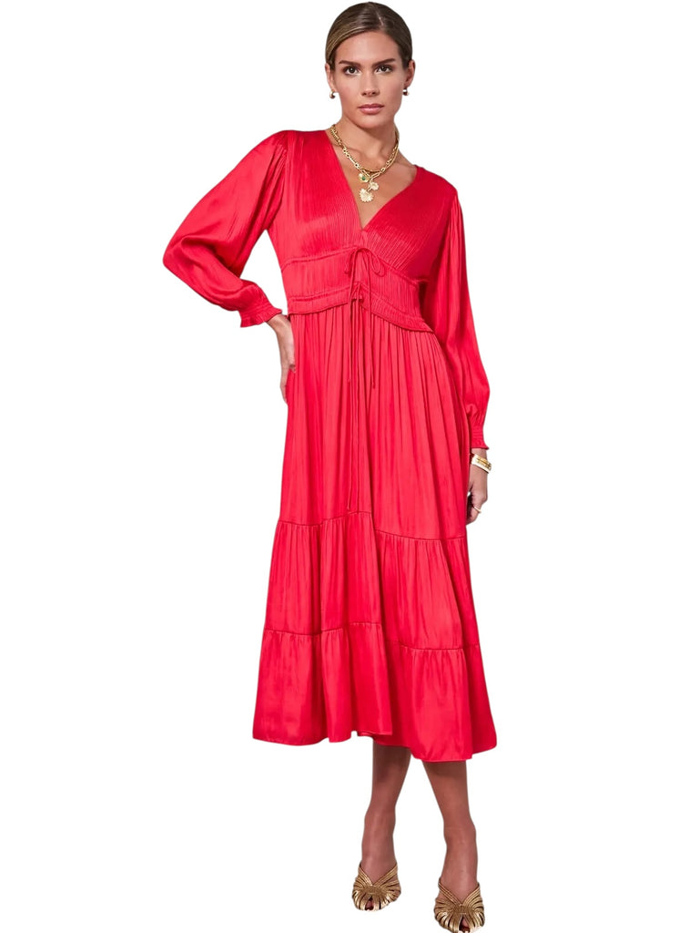 V-Neck Pleated Red Satin Dress