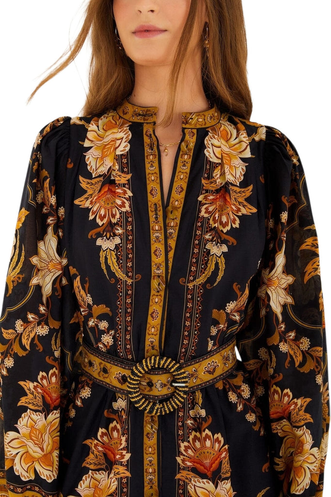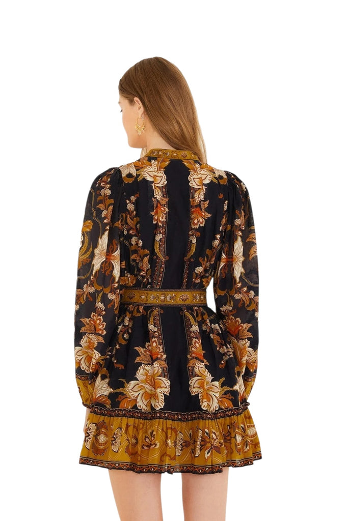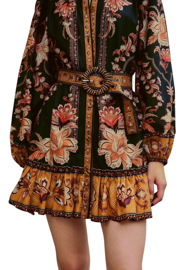 Step into a world of playful elegance with the Black Majestic Garden Beaded Buckle Long Sleeve Mini Dress by FARM Rio. This enchanting piece features a high neckline that frames the delicate beaded floral patterns cascading across rich black fabric. The long sleeves gently gather at the wrists, while the fitted silhouette flares slightly at the hem, creating a graceful movement. Accentuated by a statement beaded buckle, it’s a dress full of vibrant charm and soft sophistication.