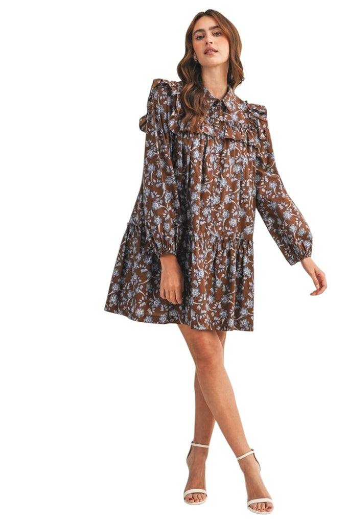 With boots or sneakers, you’ll look beyond darling in this ruffle trim button down mini dress! Woven fabric, with vintage floral print throughout, shapes this dress that has long puff sleeves, a ruffled collared neckline, and full button down placket. This dress is accented with ruffle trim on the yoke and drop waist seam.