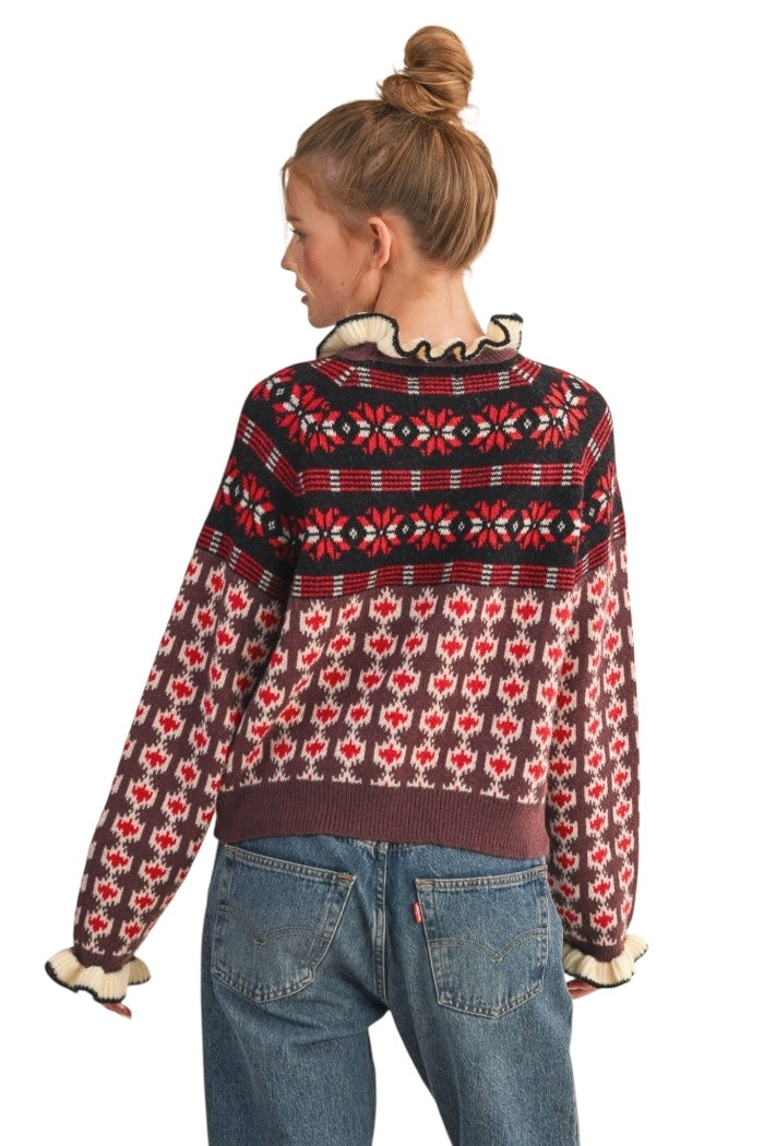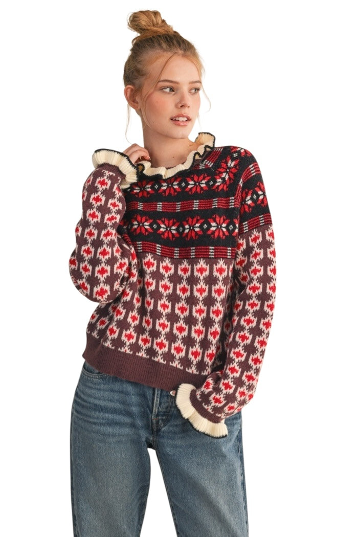 You’ll be attracting all the best attention in this ruffled mock neck fair isle sweater! Vintage-inspired fair isle knit design creates this cozy sweater with a ruffled mock neckline and long sleeves with ruffled cuffs. This comfortable waist-length bodice is perfect for pairing with high-waisted denim!