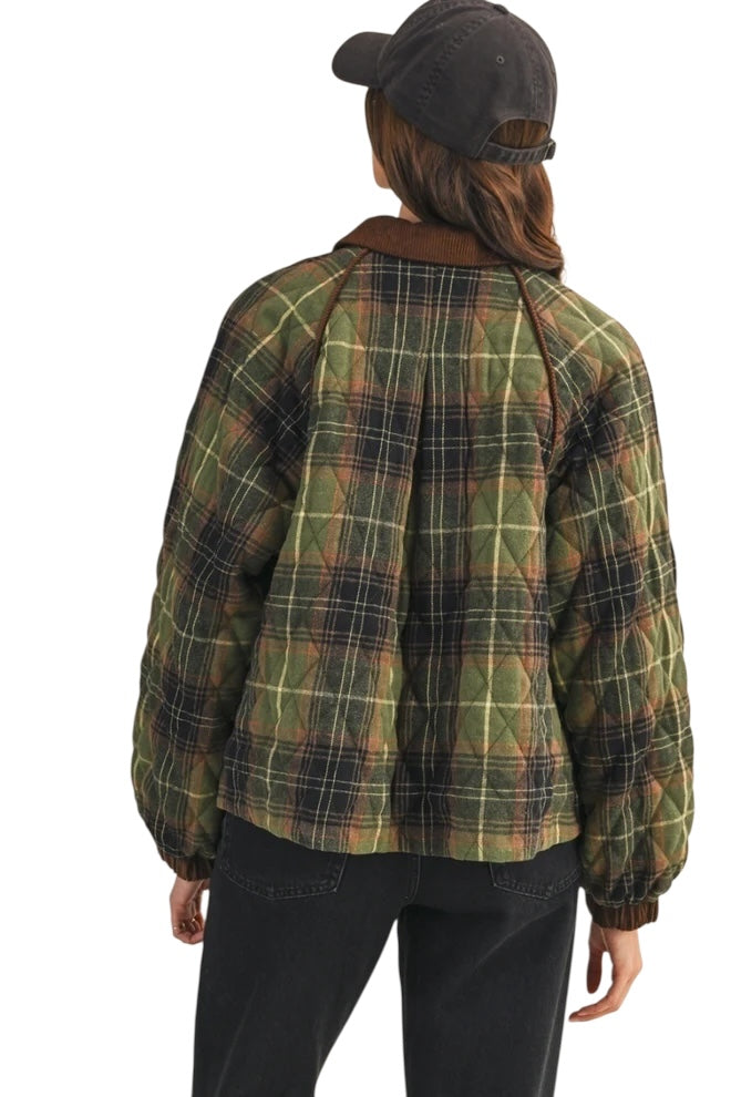 This plaid quilted jacket is ready for those crisp Fall days! This cozy and trendy jacket has a plaid quilted composition with contrast corduroy that shapes a collared neckline and button down placket. The relaxed bodice features corduroy piping along the raglan seams and long puff sleeves with corduroy cuffs. Pair with jeans and a tee for a casually cool ‘fit!