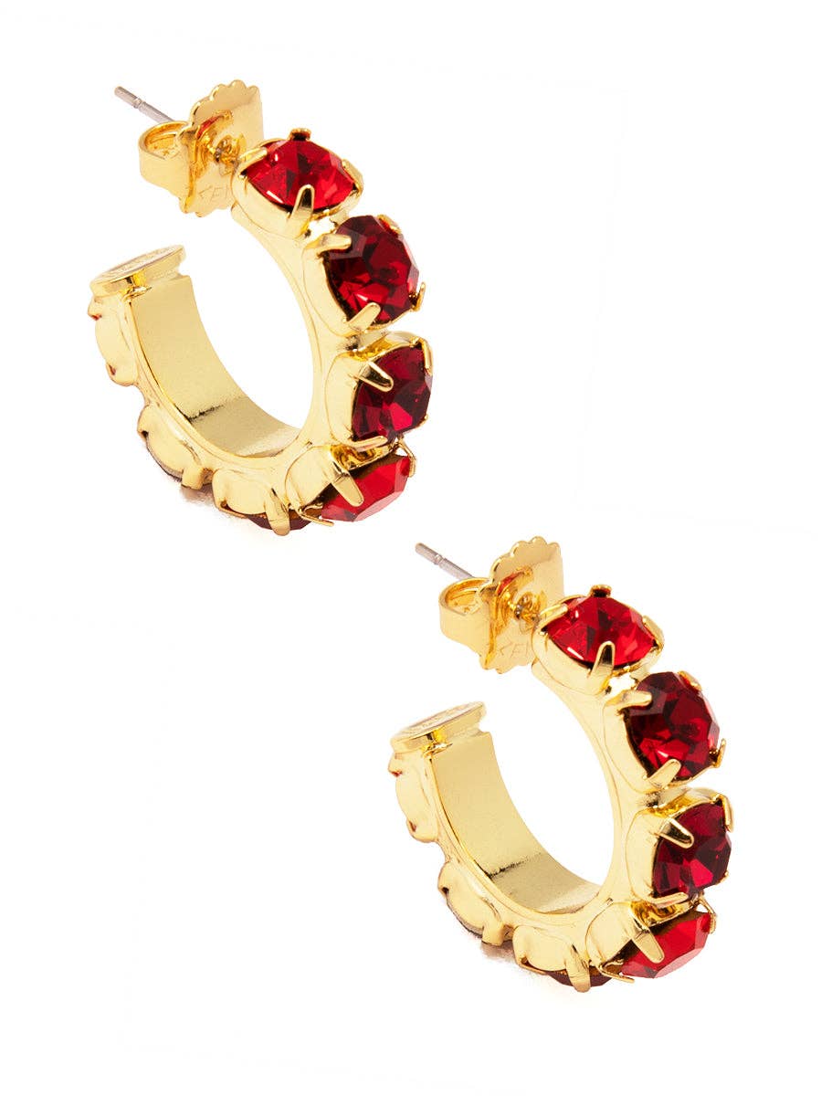 Brass-based hoop earring adorned with colorful crystals.