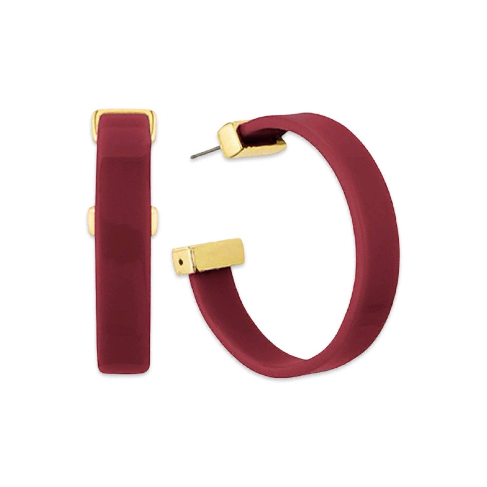 Add a bold pop of color with our maroon and gold acrylic hoop earrings. These wide open statement hoops feature sleek gold accents and lightweight acrylic for all-day comfort. Perfect for game day jewelry, boutique accessories, and everyday style, these earrings instantly elevate any outfit with a modern, polished look. • ✓ Lightweight acrylic with gold trim – easy to wear all day • ✓ 1 ¾” wide open hoop design – chic, modern silhouette • ✓ Post backing – secure and comfortable fit •
