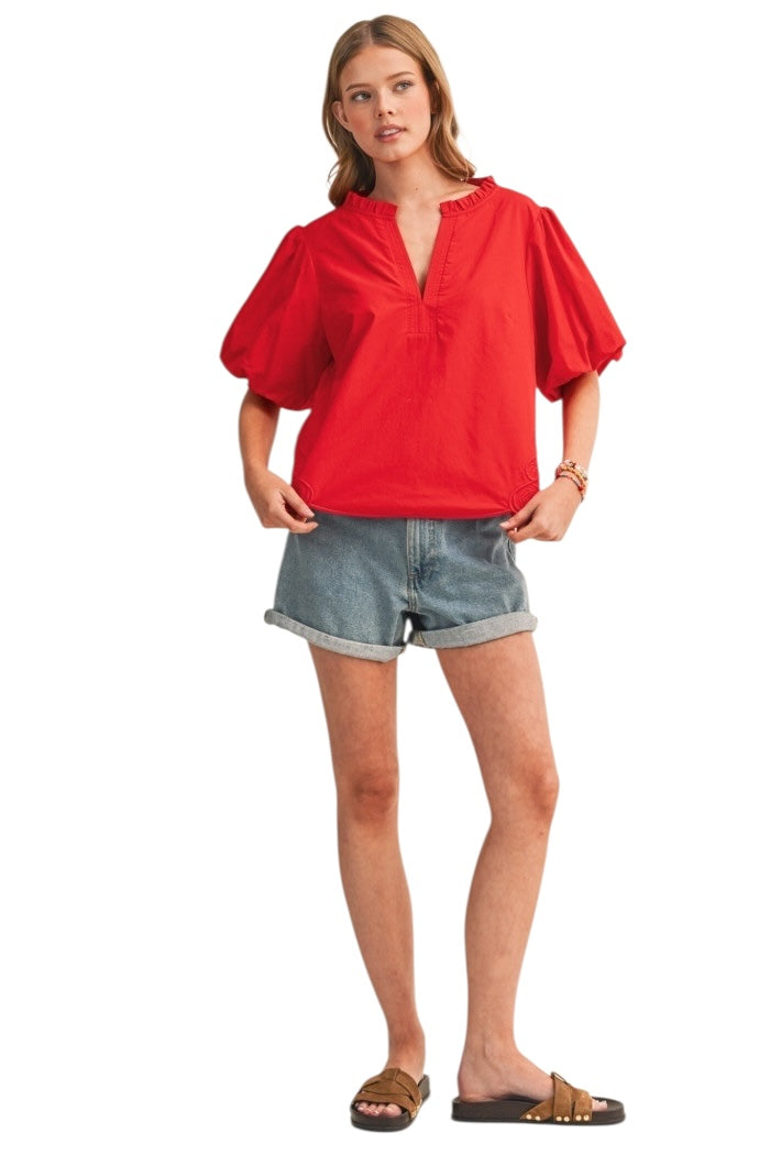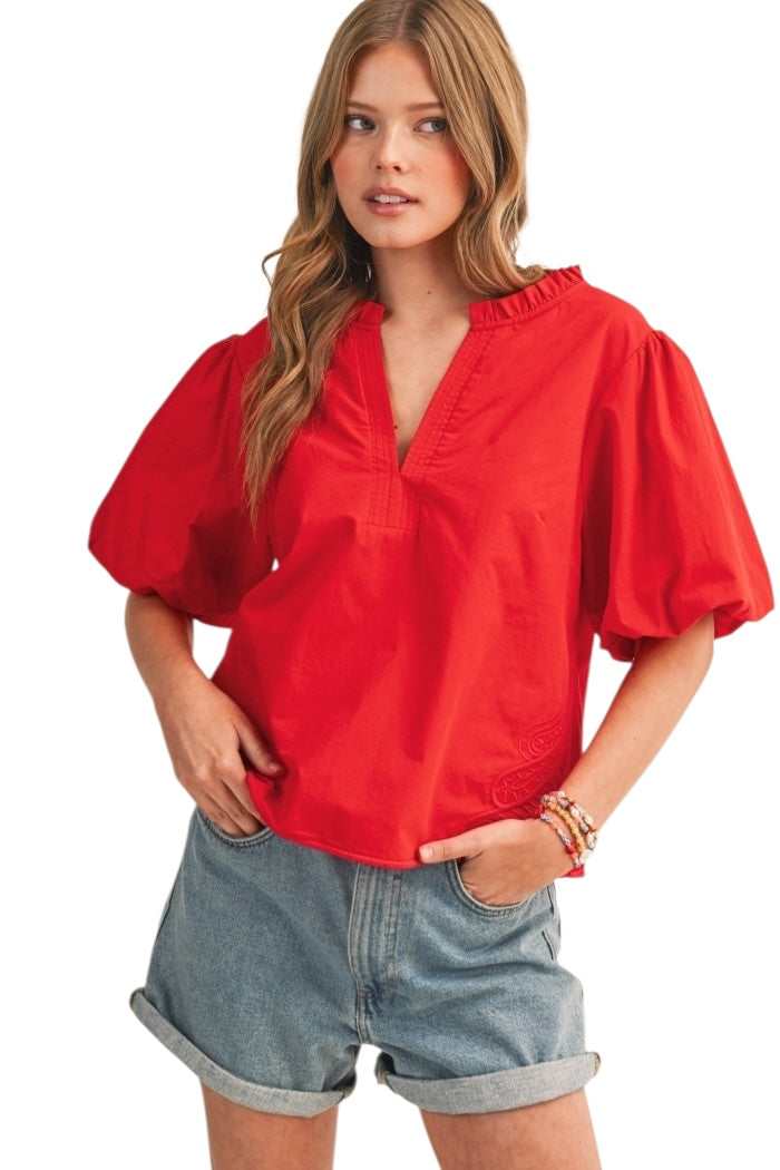 This bubble sleeve embroidered top was designed for effortless everyday looks! Lightweight woven fabric shapes this top that features a flattering ruffled V neckline framed by voluminous short bubble sleeves. Embroidered detail on the sides adds a modern touch to this gorgeous top.
