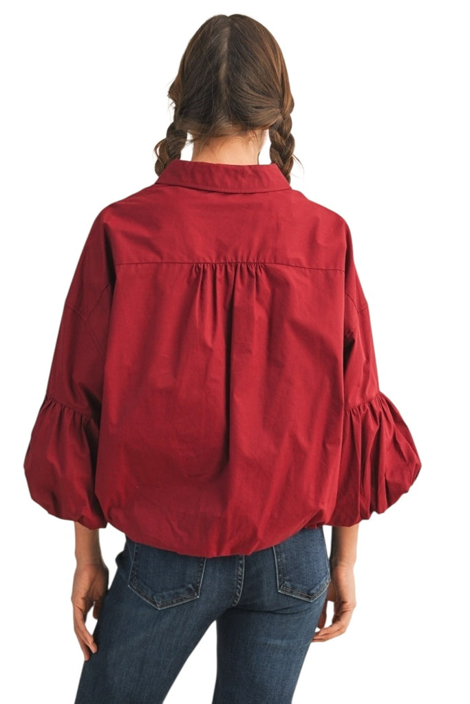 This button down bubble hem top is a season fave! Lightweight cotton shapes this top that has a button down placket and 3/4 sleeves that end in a flirty bubble cuff. The bodice ends at a slightly cropped bubble hem. Pair with high waisted jeans for the perfect Fall look!