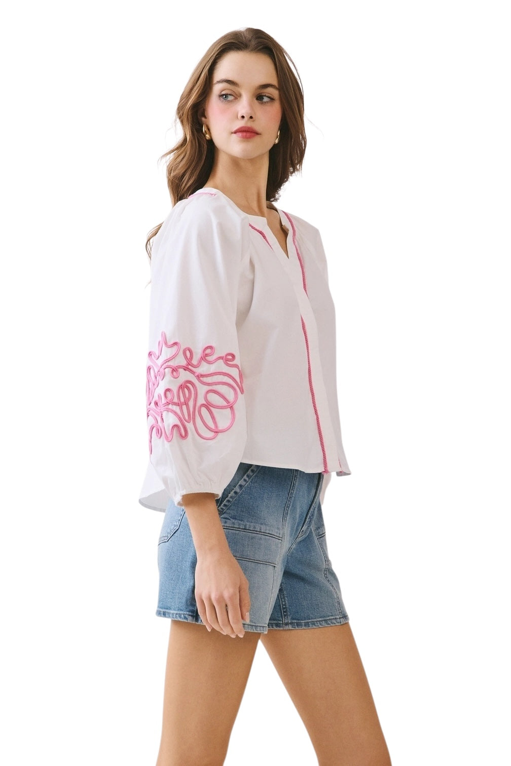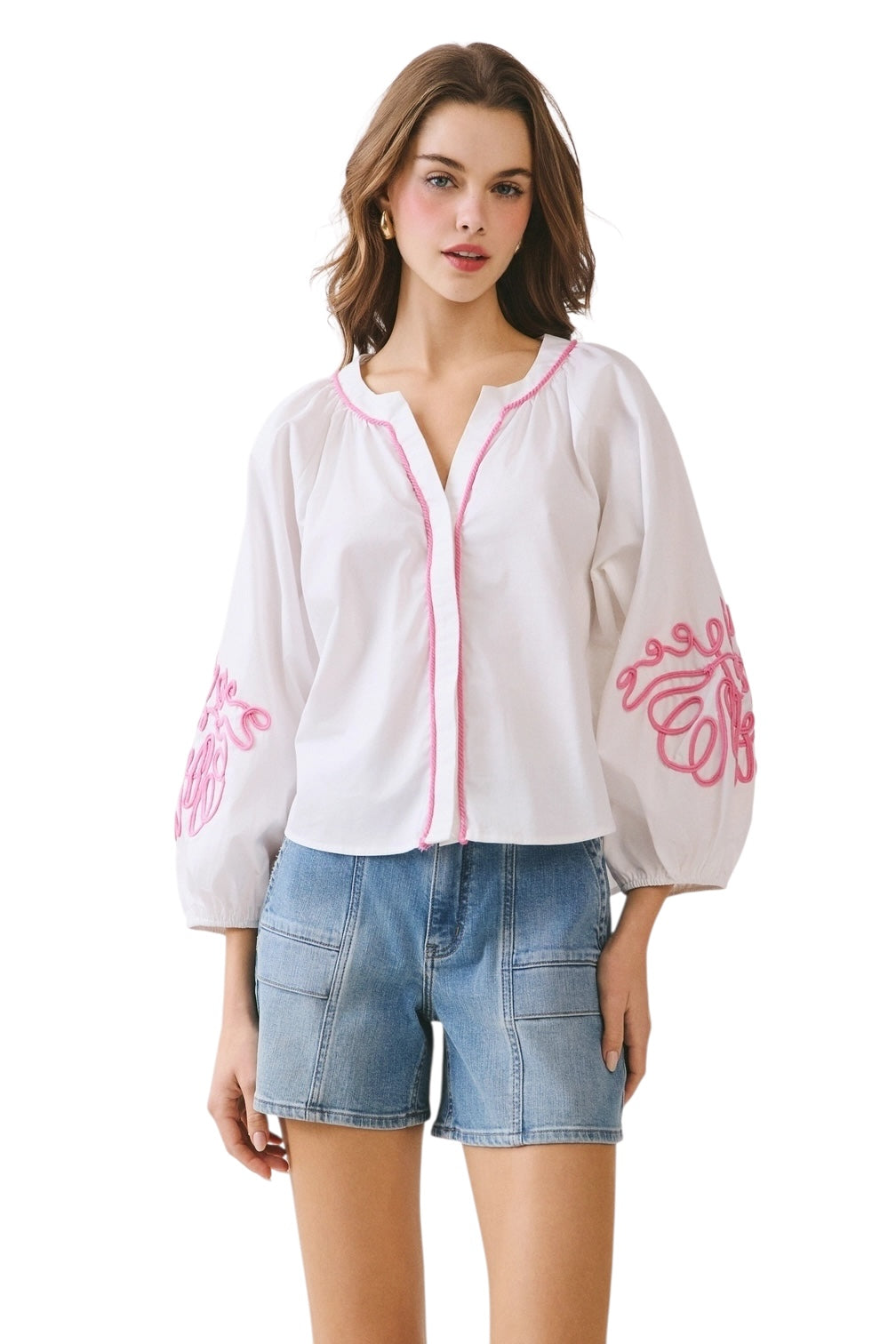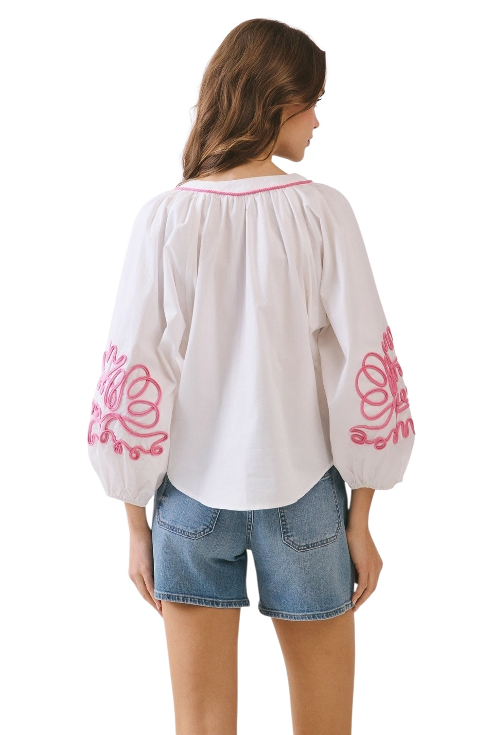 A voluminous 3/4 puff sleeves blouse with a bold embroidery. Designed with a split neckline and contrast trim along the placket and collar. Model Size + Fit: Model height: 5'11" Dress size: Small Bust: 31.5 Waist: 23.5 Hips: 35