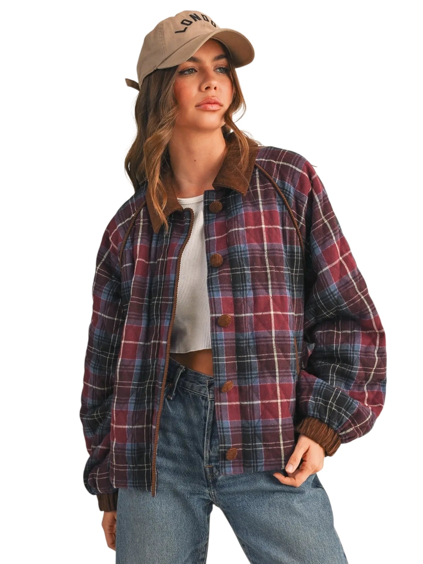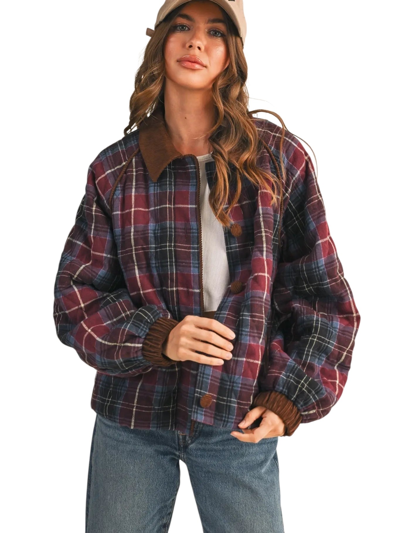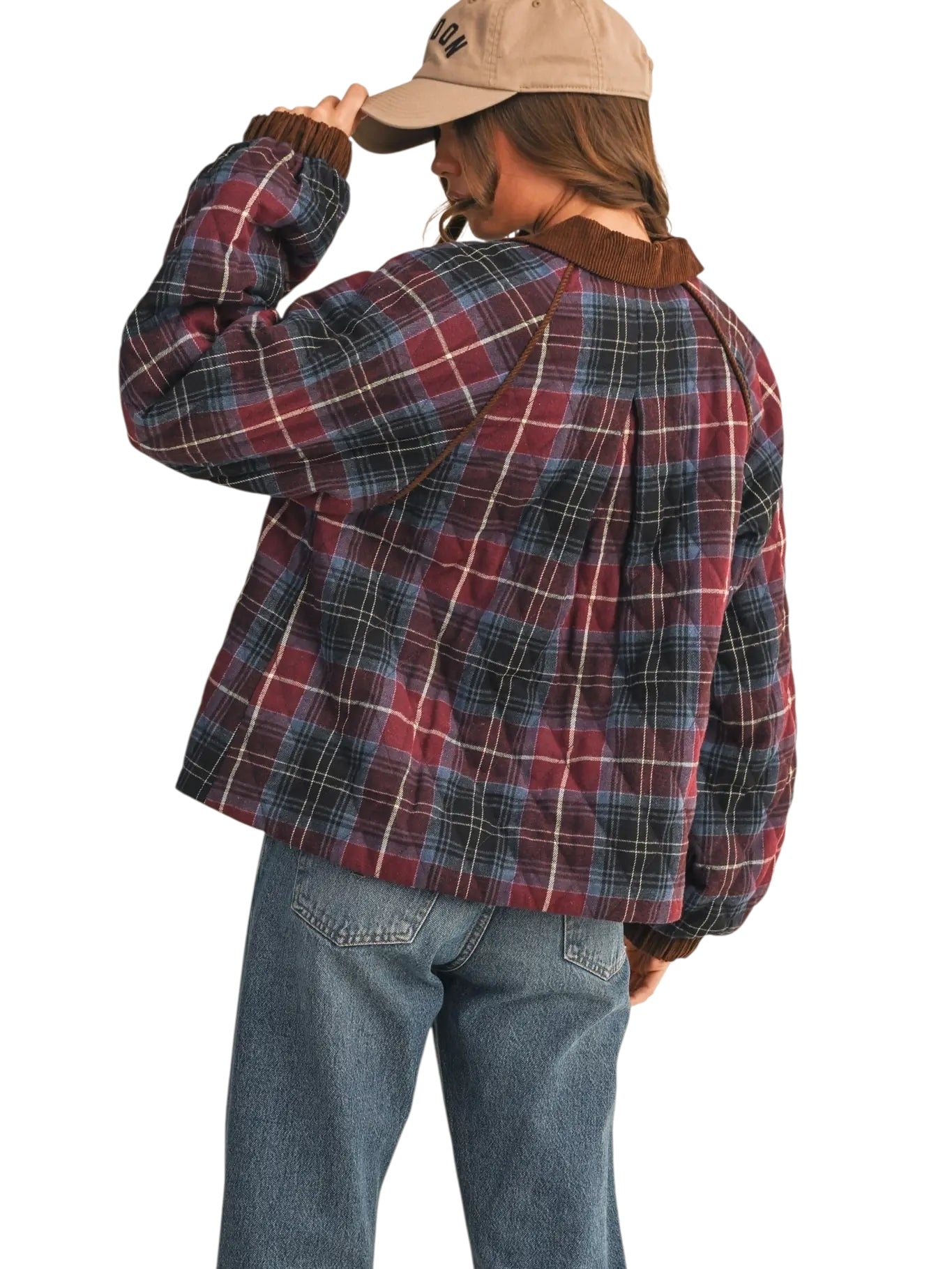 This plaid quilted jacket is ready for those crisp Fall days! This cozy and trendy jacket has a plaid quilted composition with contrast corduroy that shapes a collared neckline and button down placket. The relaxed bodice features corduroy piping along the raglan seams and long puff sleeves with corduroy cuffs. Pair with jeans and a tee for a casually cool ‘fit!