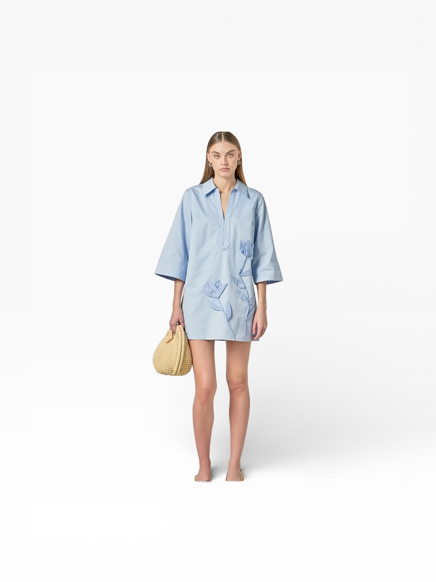 Make a statement in our Appliqued Striped Shirt Mini Dress! This must-have piece boasts a unique V neckline and collared design for a touch of sophistication. With a pull over style and mini length, it's both effortless and chic. The striking striped pattern is accentuated by beautifully crafted appliques for a pop of charm. This dress is perfect for any occasion, from casual gatherings to special events. Embrace both style and comfort with this must-have addition to your wardrobe. Don't wait, grab yours now and be the envy of everyone! * Pull over * Mini length * V neckline * Collared * Elbow-length sleeve with cuff * Striped * Applique detail * Hand wash cold * Do not bleach * Do not tumble dry * Iron low * Shell: 100% Cotton * Lining: 100% Cotton * Contrast: 65% Polyester, 35% Nylon