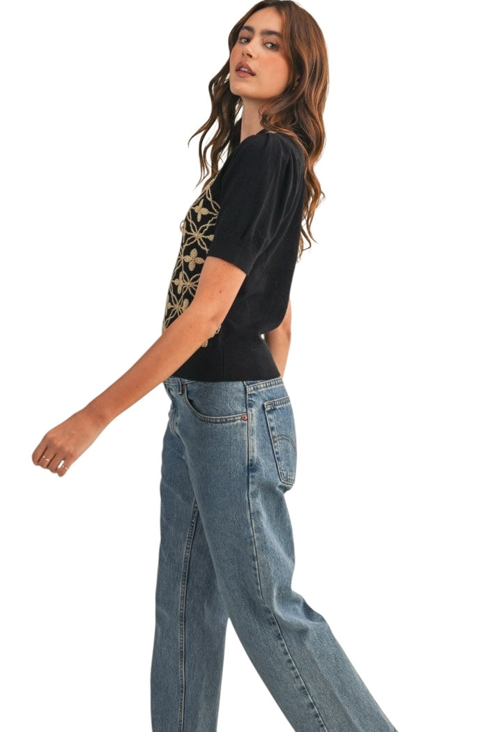 + Short puff sleeve embroidered sweater