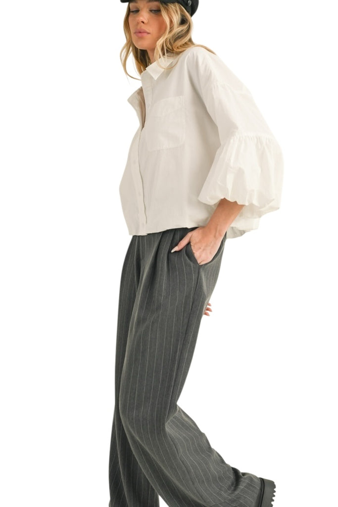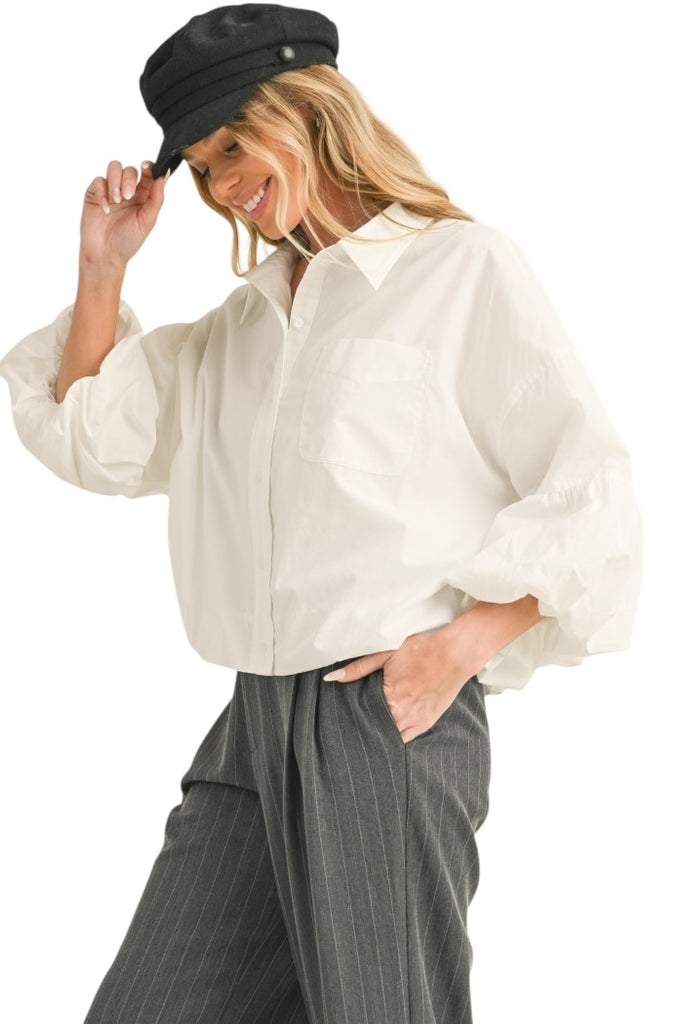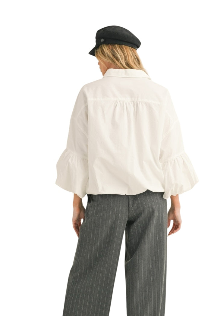 This button down bubble hem top is a season fave! Lightweight cotton shapes this top that has a button down placket and 3/4 sleeves that end in a flirty bubble cuff. The bodice ends at a slightly cropped bubble hem. Pair with high waisted jeans for the perfect Fall look!