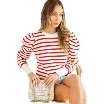 - Ribbed Crew neck striped fashionable knit sweater - Puff long-sleeve ribbed hem