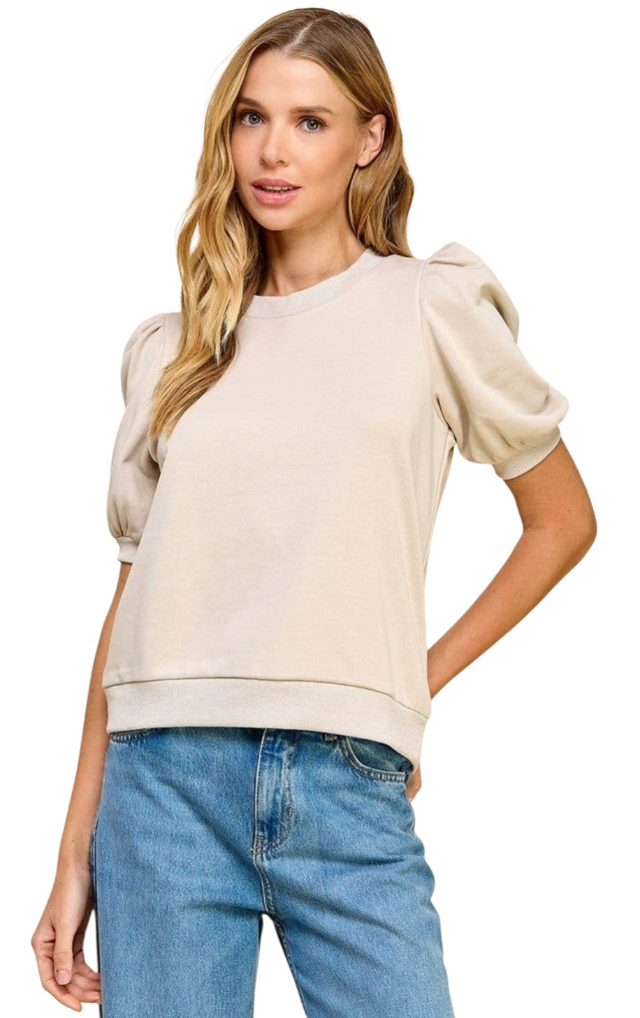 A knit top featuring a crew neckline, short puff sleeves with gathered shoulders, and ribbed cuffs and hem for a polished fit.