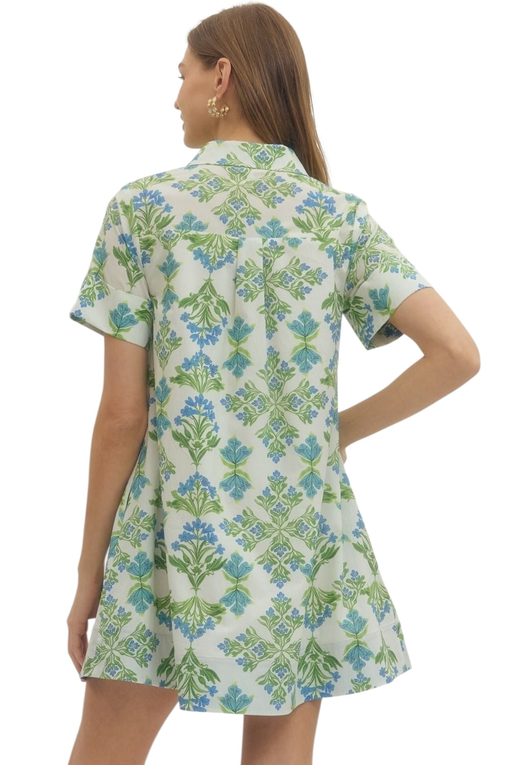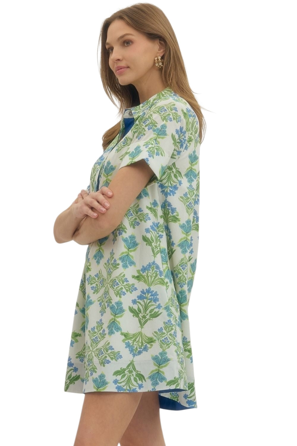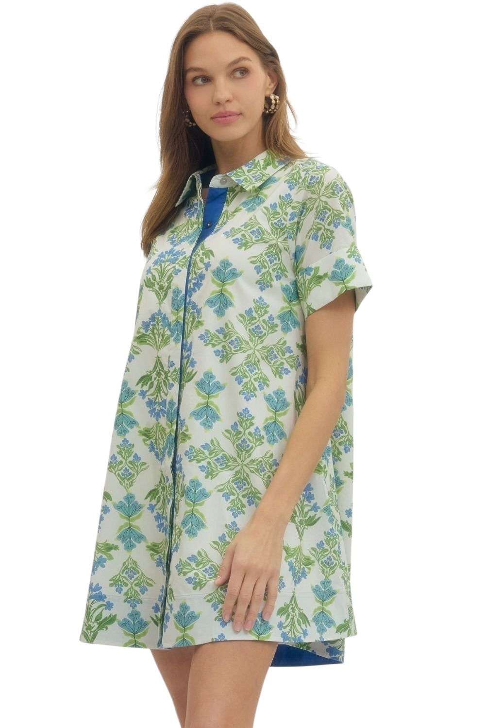 Floral print short sleeve mini dress featuring spread collar and hidden button closure at front. Side pockets. Lined. Woven. Non-sheer. Lightweight.