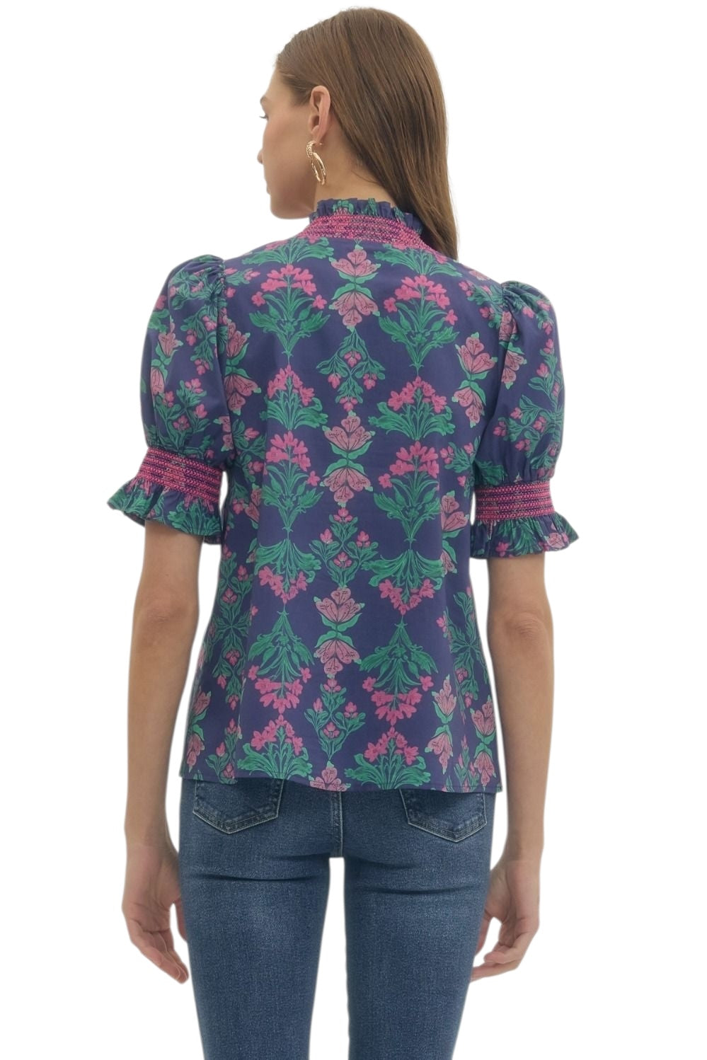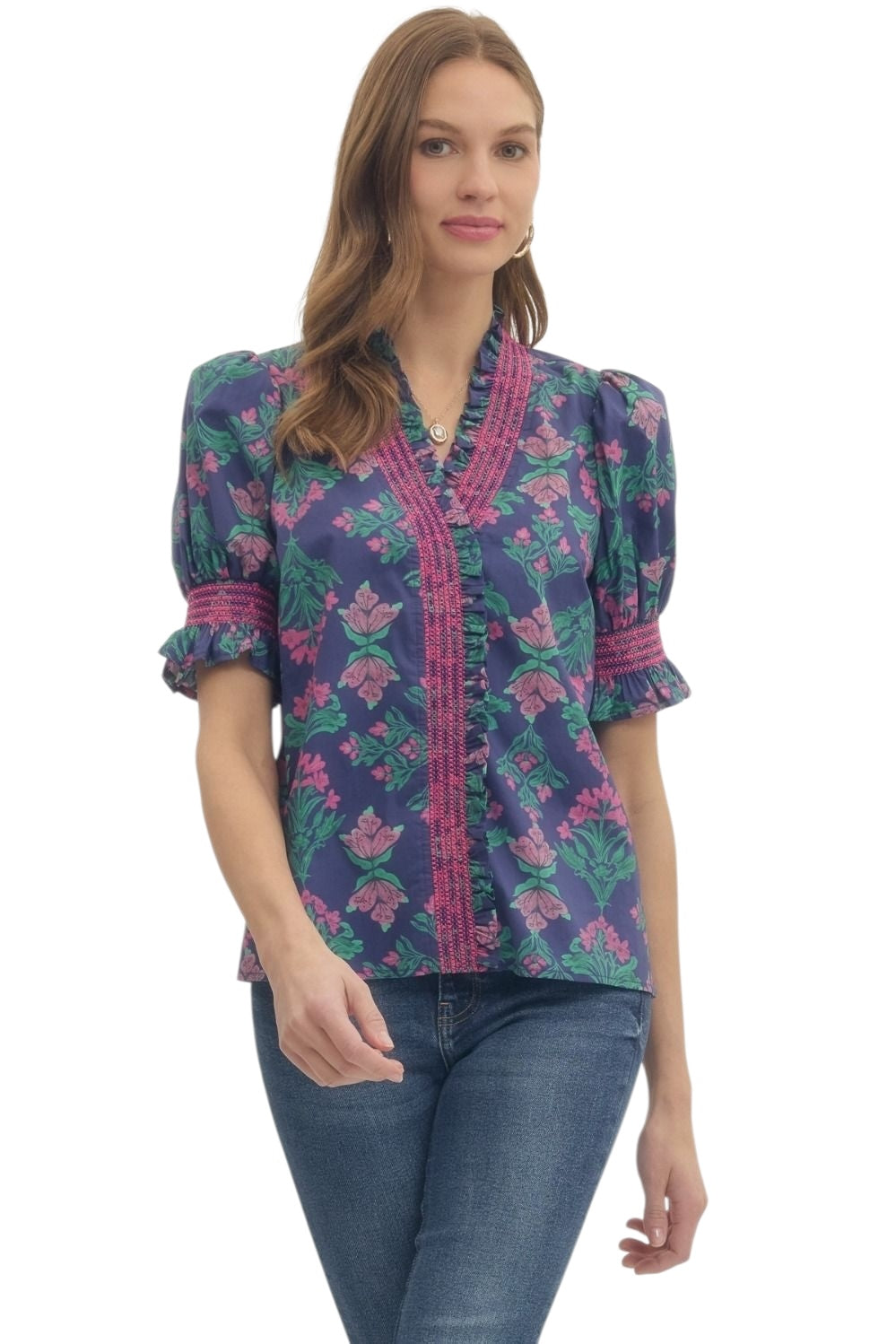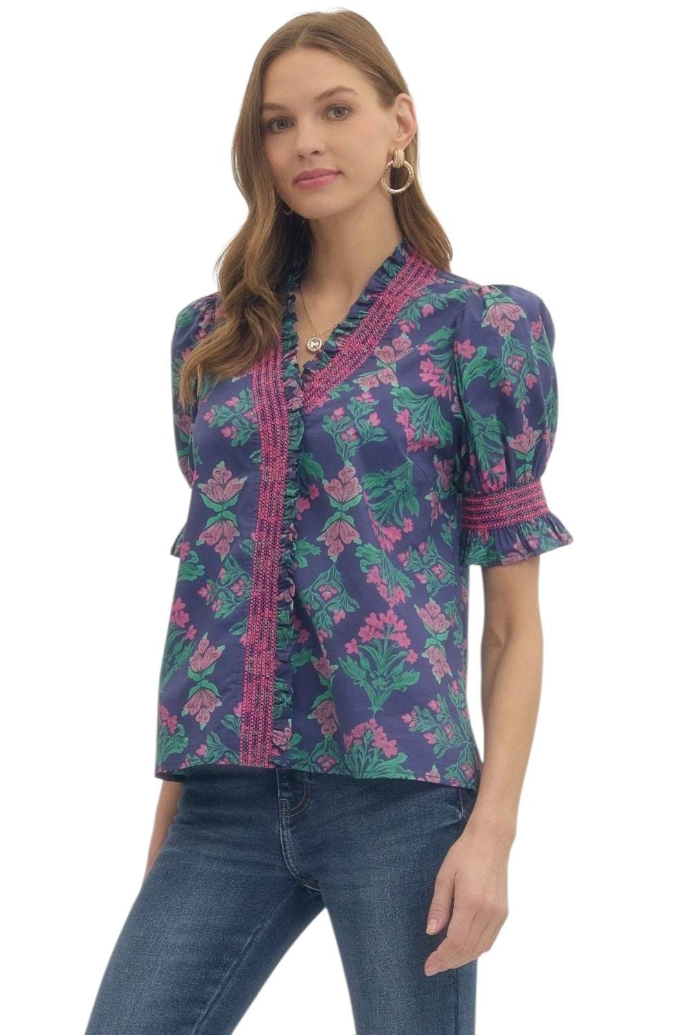 Floral short puff sleeve top featuring ruffled V-neck and smocked elastic sleeve cuffs.