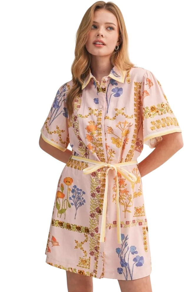 Any Spring day is better with flowers, and we’re keeping this floral tape trim shirt dress on repeat! Woven floral fabric shapes a collared neckline, button down placket, and short sleeves with tape trim on the cuffs. A tying sash made with more tape trim tops a mini hem with pockets. Pair with sneakers, boots, or sandals for a Spring ‘fit you’ll wear all season long!