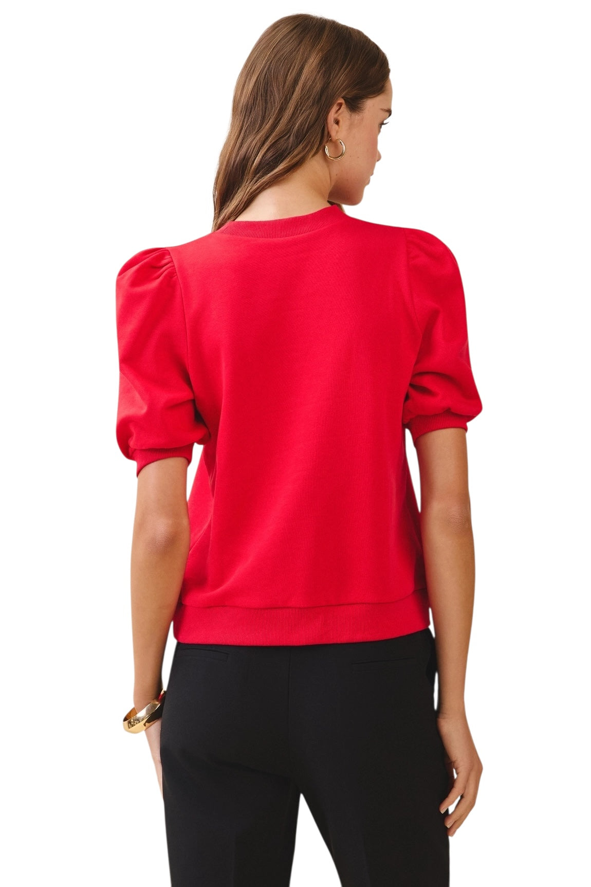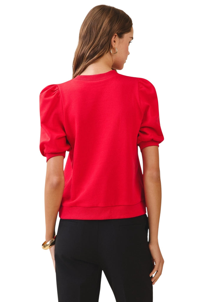 A knit top featuring a crew neckline, short puff sleeves with gathered shoulders, and ribbed cuffs and hem for a polished fit.