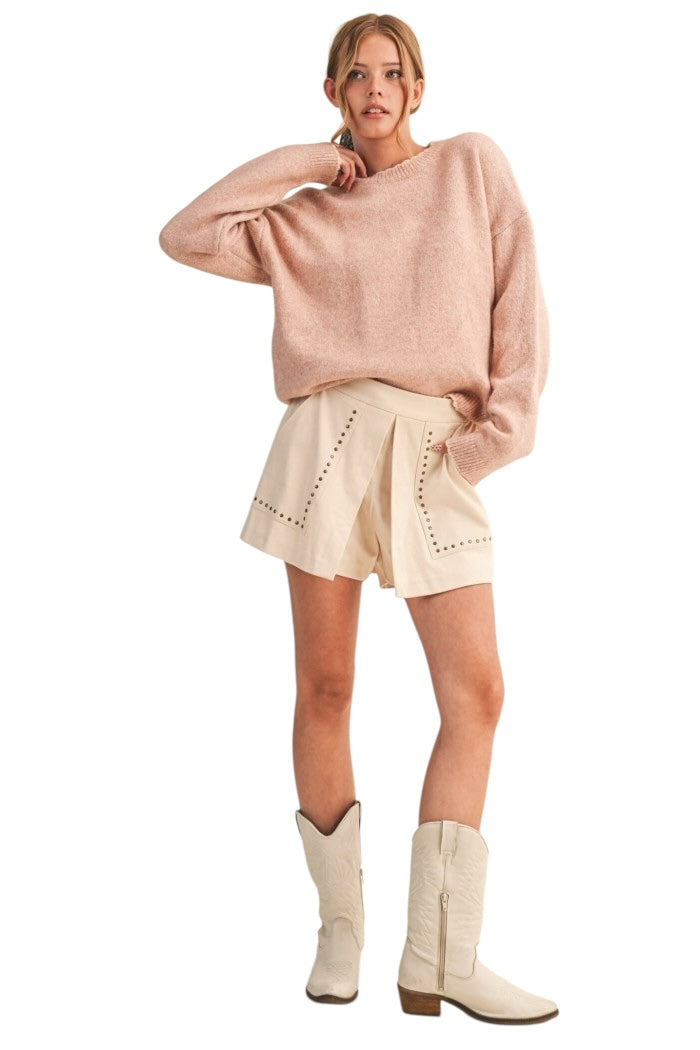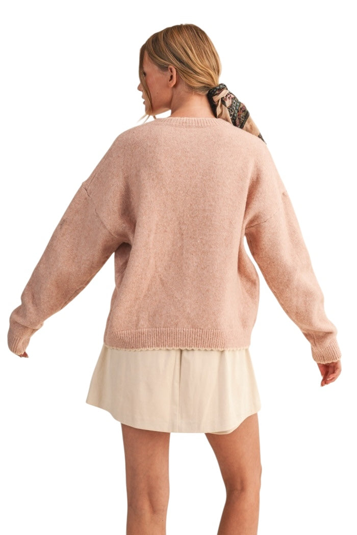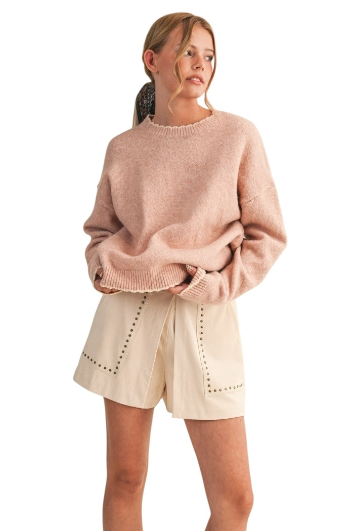 Styling outfits just got easier with this classic scalloped edge sweater! Cozy heathered sweater knit shapes a classic round neckline, a relaxed bodice, and drop shoulder long sleeves with ribbed cuffs. Contrast knit with scallop detailing on cuffs, neckline, and hem.