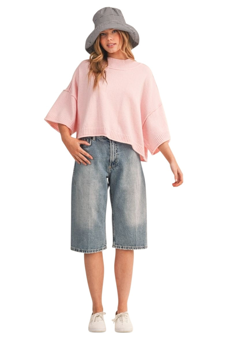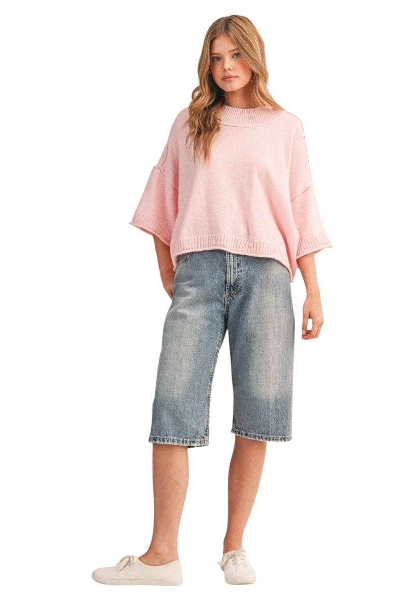 You’ll be reaching again and again for this mock neck short sleeve sweater for those laidback days! Cozy marled knit shapes a semi-cropped, slightly boxy bodice with a mock neckline and drop shoulder wide short sleeves. Raw edge seam detail and ribbed knit at neckline, cuffs, and hem.