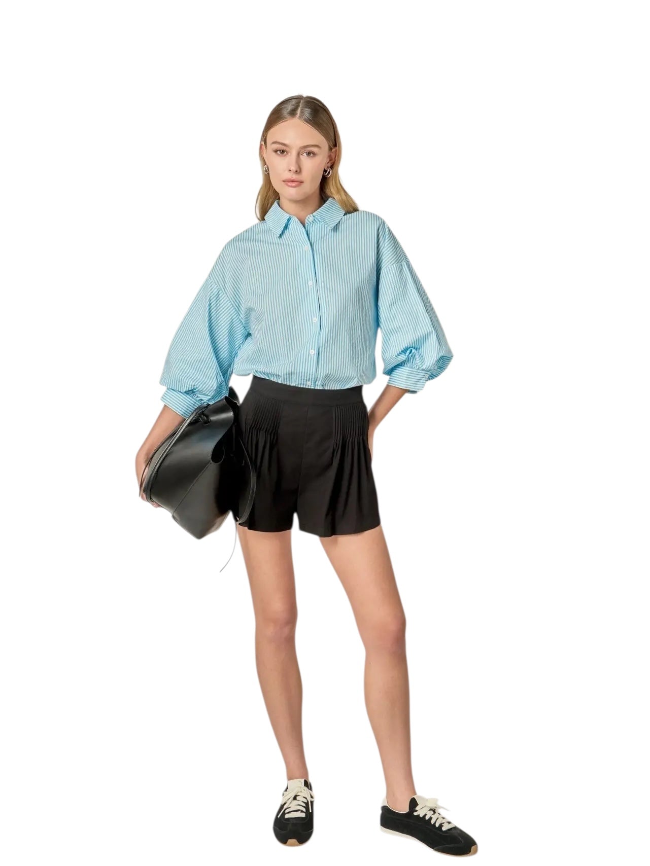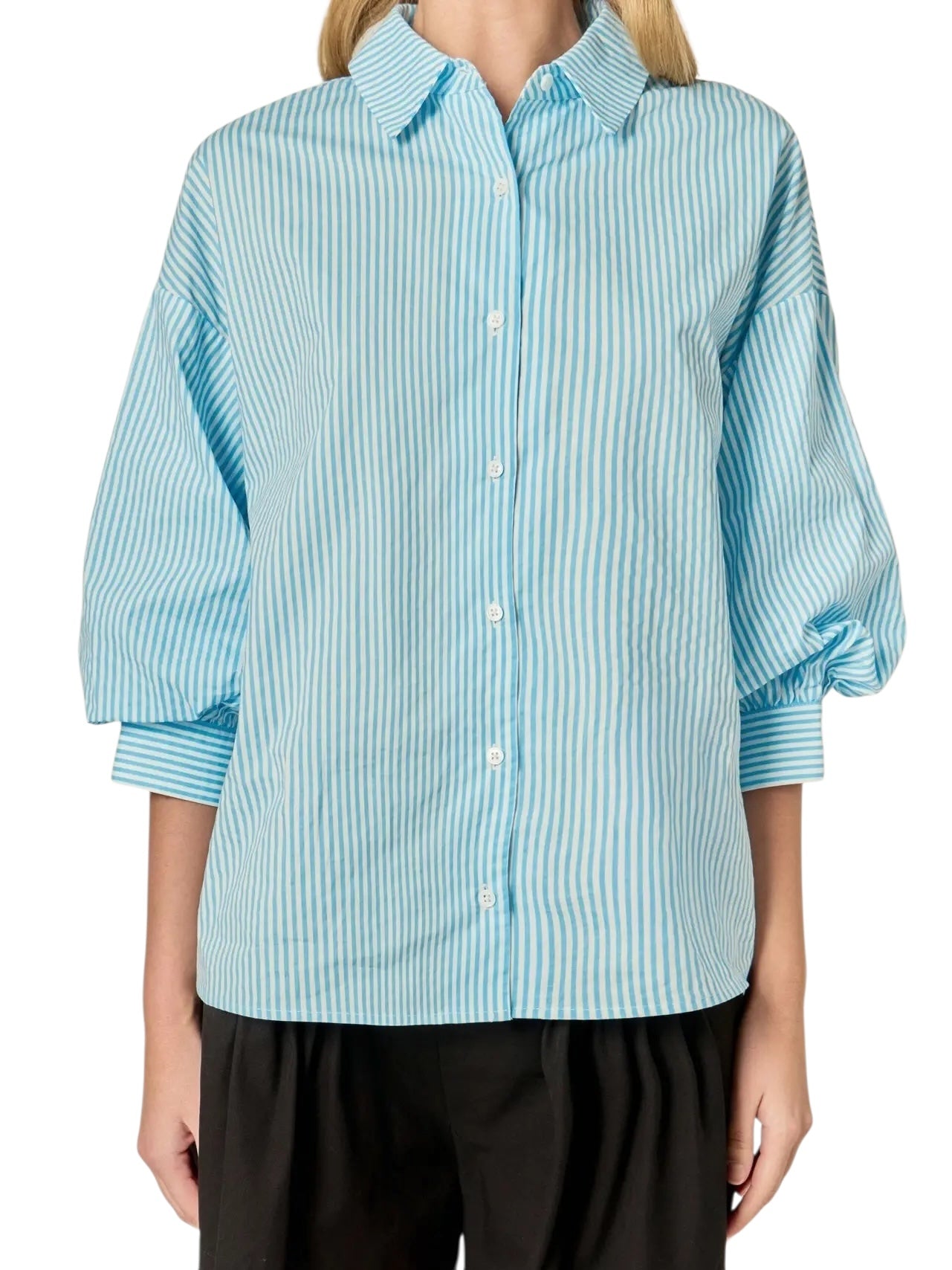 A closet classic with a modern twist, our Striped Button Down Shirt is your new go-to for effortless polish. Crafted from soft, high-quality fabric, it features timeless vertical stripes, a crisp collar, and a relaxed silhouette with drop shoulders and roomy sleeves. Whether you're styling it for work, weekends, or layering year-round, this versatile top brings instant sophistication to any look. * Relaxed fit * Puff sleeve * Three-quarter sleeve * Collar with stand * Sleeve with lining * Back panel with gathers * Hand wash cold * Do not bleach * Do not tumble dry * Iron low * Shell: 97% Cotton 3% Nylon * Lining: 100% Polyester