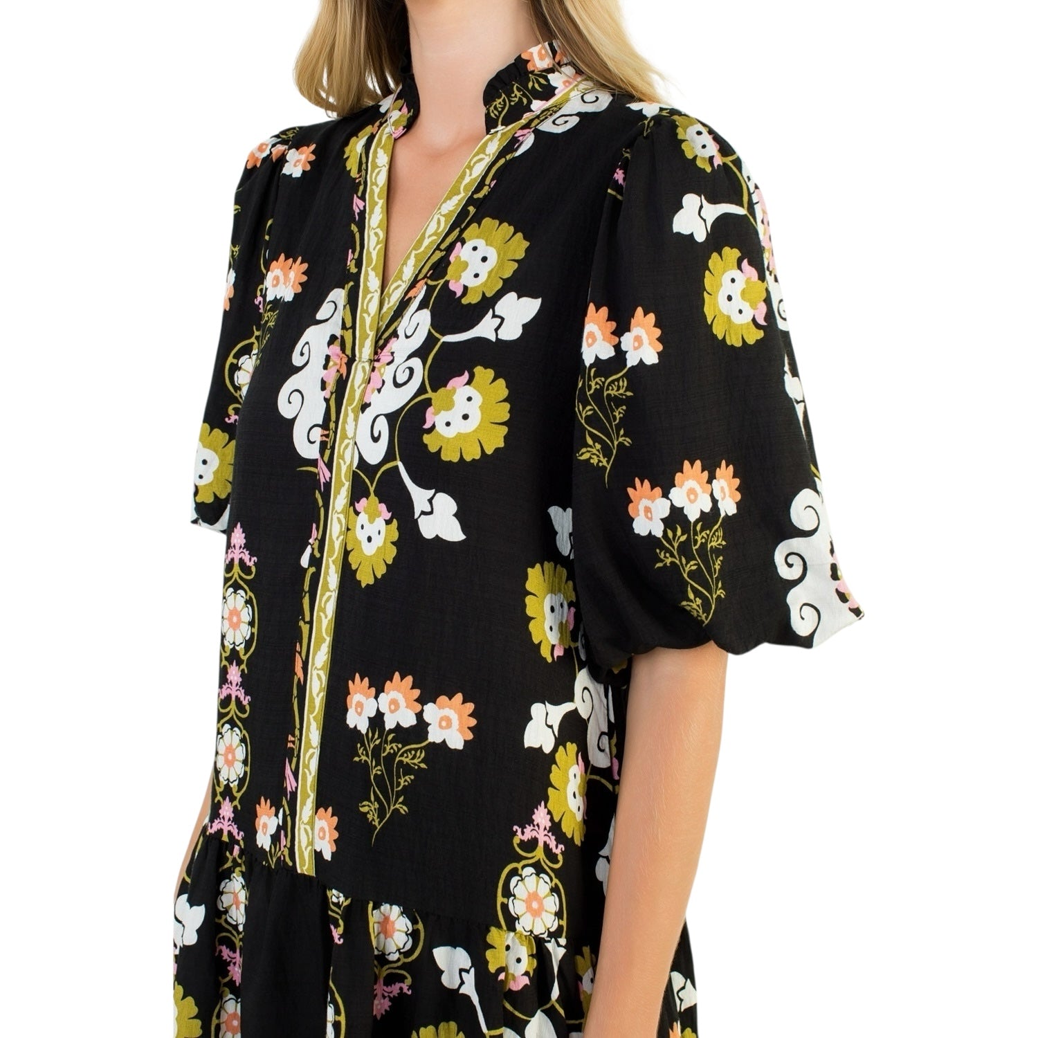 Puff Sleeve V-Neck Floral Mini Dress . / Style Measurements for Size S / Designed in USA - Body Length: 35 in - Bust Width: 37 in - Sleeve Length: 14 in . / Model Sizes - Wearing Size S - Height 5' 9", Bust 32", Waist 25 1/2", Hips 36" .