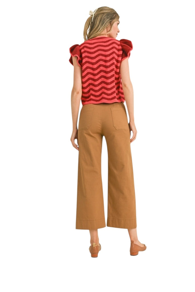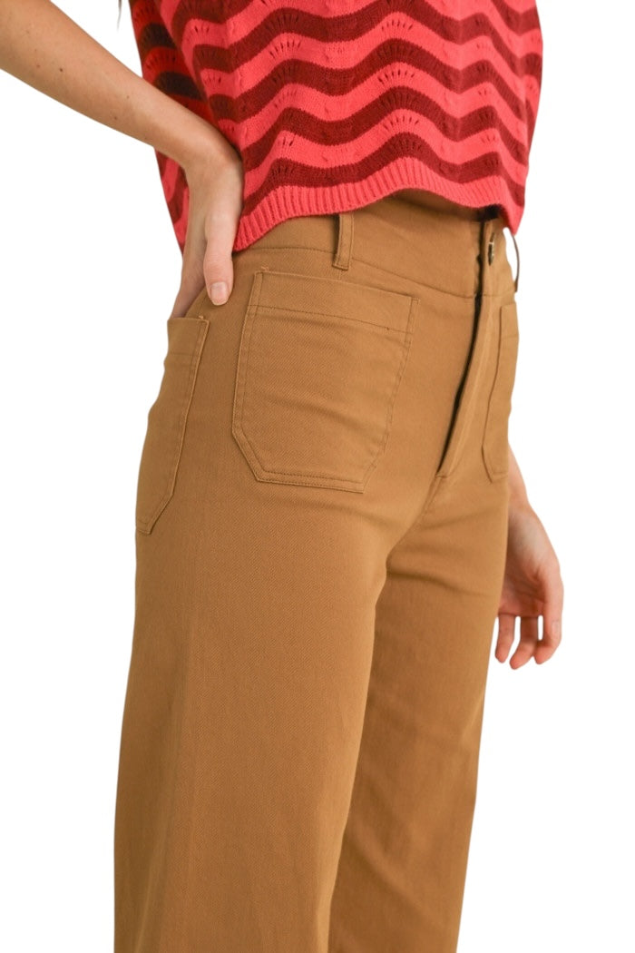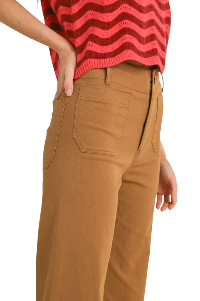 Create an effortlessly laidback look with these cropped wide leg pants! Stretchy and sturdy fabric shapes these ultra cool pants that have a high-waisted fit with a zipper and button closure. The wide legs have front and back patch pockets to add a utility element. Pants end at cropped length.